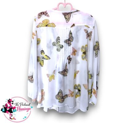Together Butterfly Print Sheer Blouse – Size UK 12 – Floaty Chiffon Button Front Top Condition: New without Tags Beautiful Together lightweight blouse featuring a delicate butterfly print in soft pastel tones including yellow, blush and grey on a sheer white chiffon-style fabric. This floaty blouse features long sleeves, a button-front design and pleated detailing…