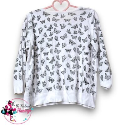 White Butterfly Print Lightweight Jumper Sweater – Size L (Fits UK 10) – Casual Knit Condition: Preloved – Excellent Condition Cute white lightweight jumper featuring an all-over black butterfly print that gives it a soft, feminine look. The jumper has a relaxed fit with a classic round neckline, ribbed hem and cuffs, making it comfortable…