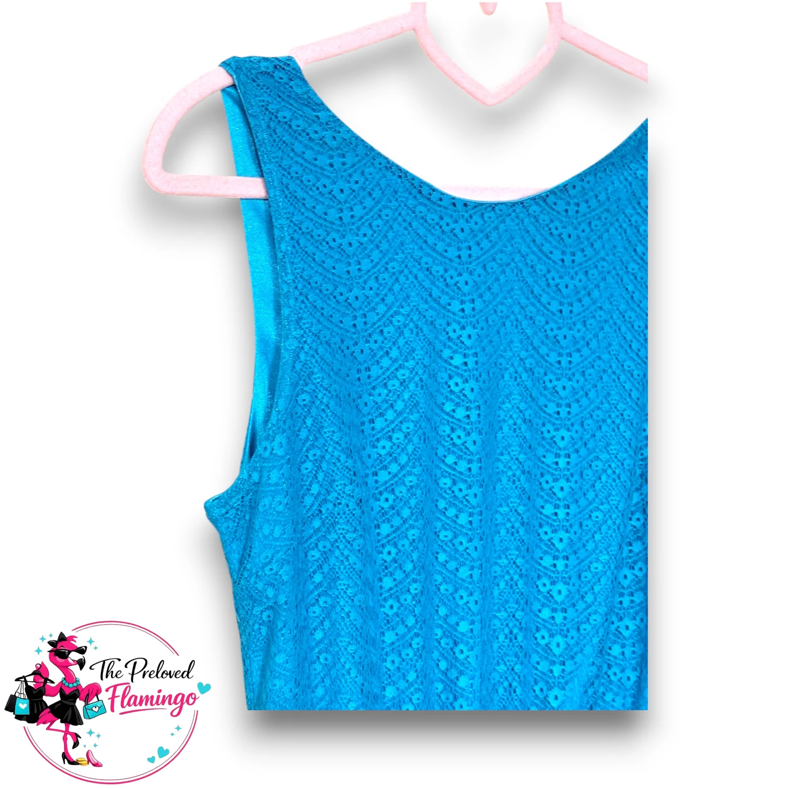 Beautiful ASOS turquoise blue lace midi dress featuring a flattering V-neckline, sleeveless design and adjustable tie waist to create a lovely silhouette.