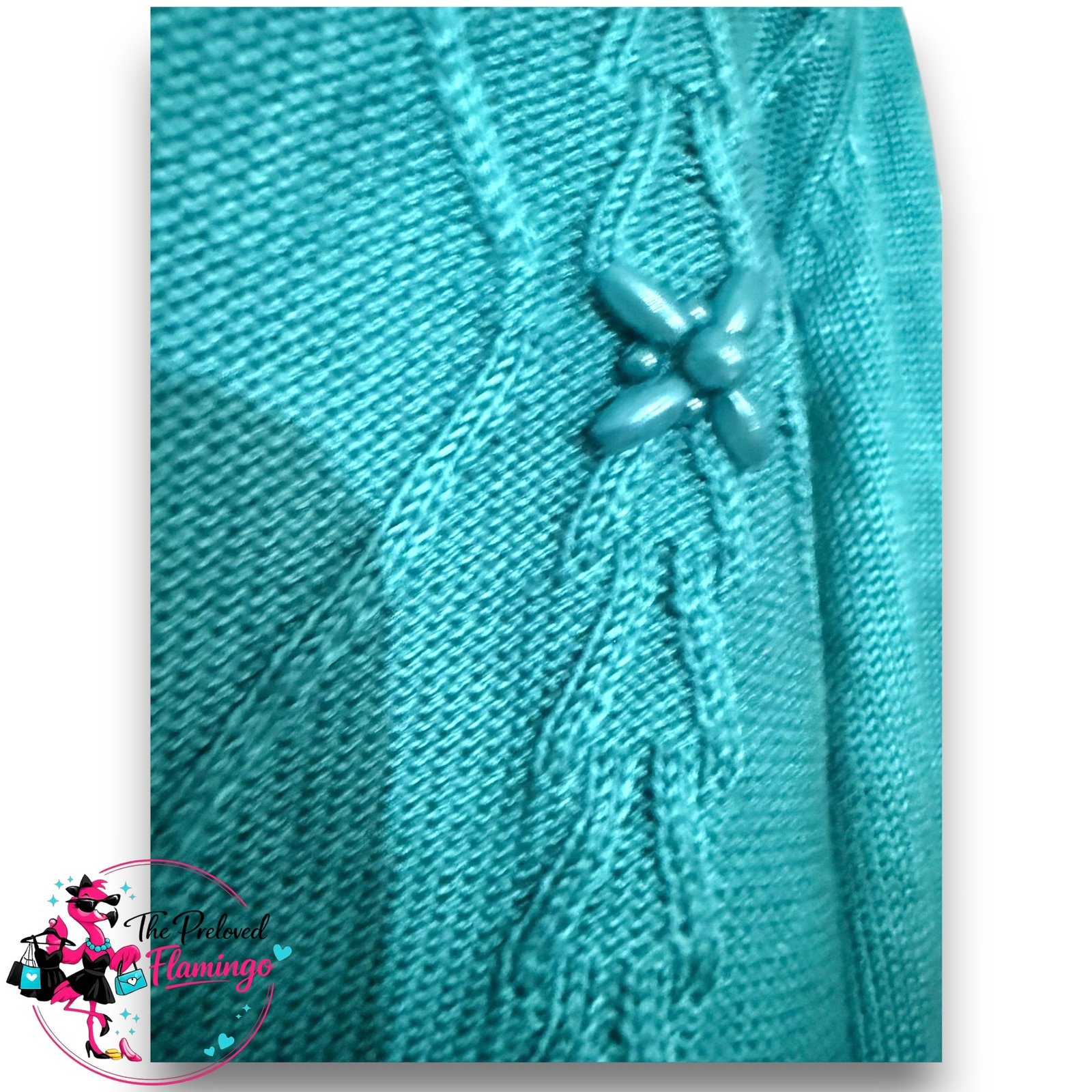 Lovely Bonmarché teal jumper featuring a pretty cable knit style pattern across the front with small decorative floral bead details that add a subtle feminine touch.