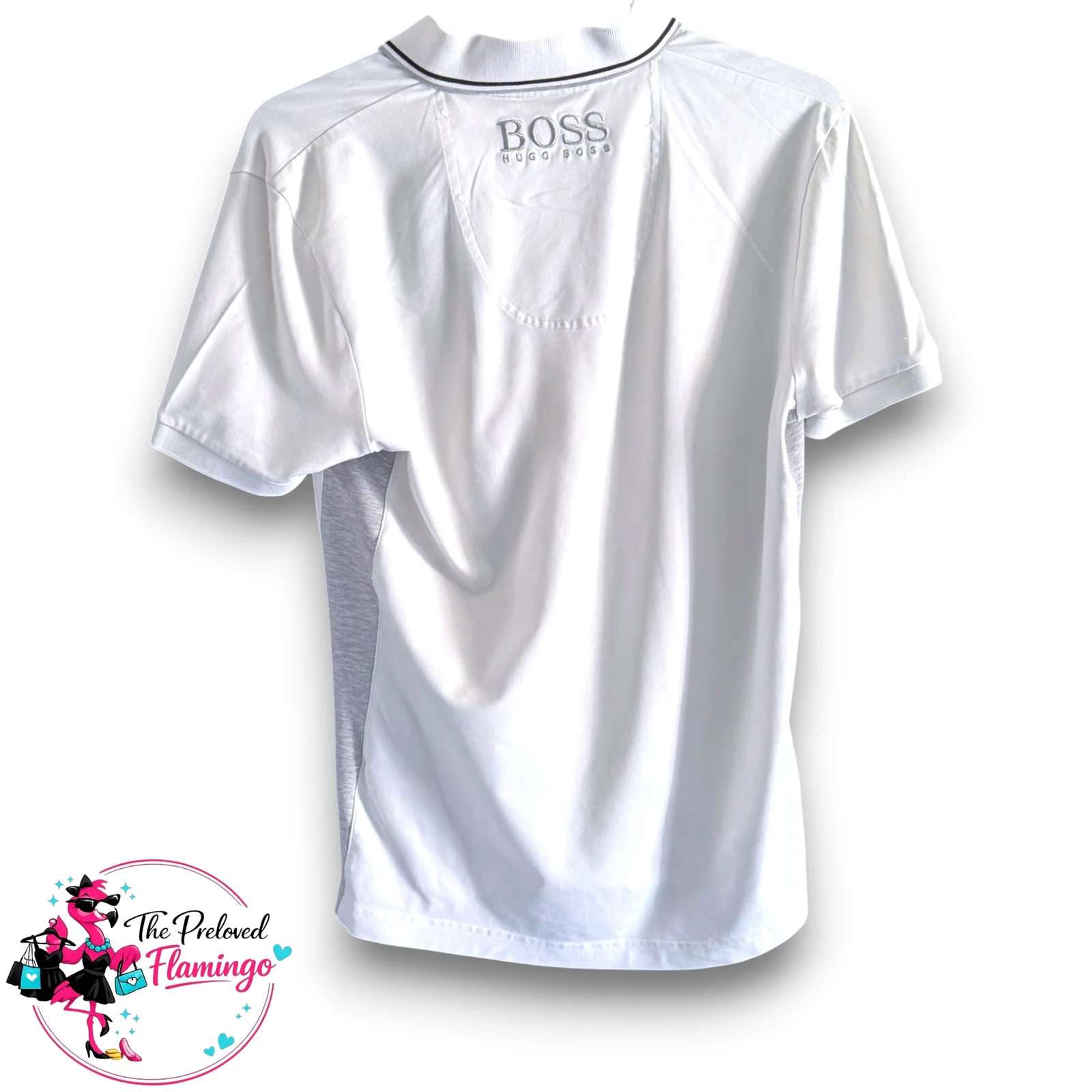 BOSS Hugo Boss White Polo Shirt – Paddy Pro 1 Modern Fit – Grey Panel – Mens Small