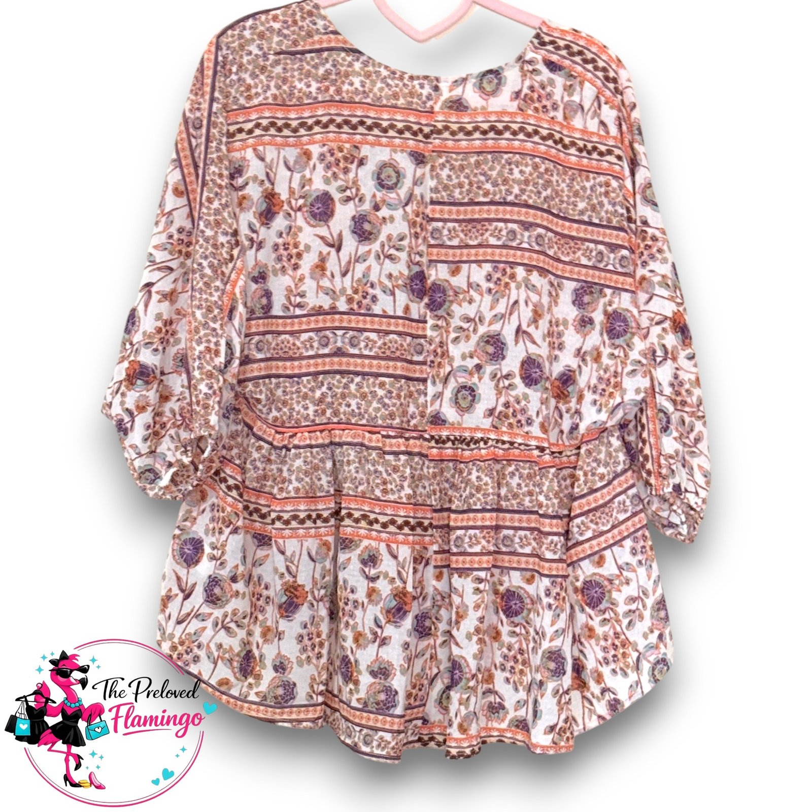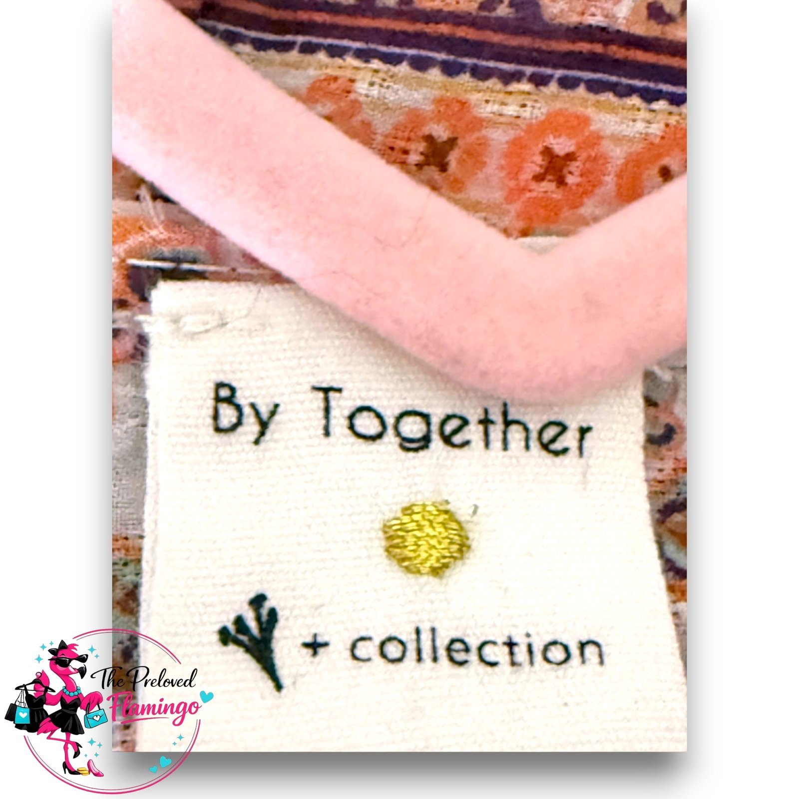 Beautiful boho style blouse from By Together + Collection featuring a soft cream base with rust, brown and muted floral print detailing in a pretty mixed pattern design.