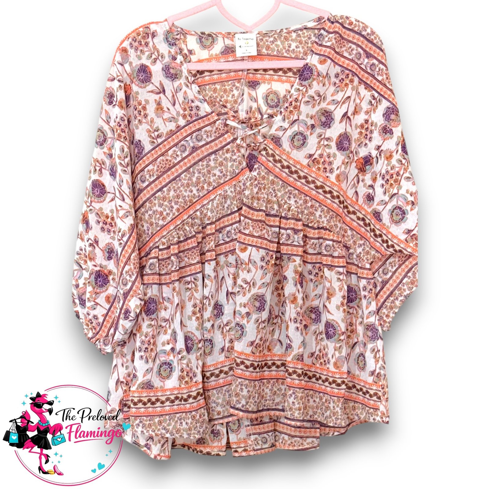 Be the first to review “By Together Boho Floral Peplum Blouse Cream Rust Floral Print Tie Neck Top Boho Blouse”