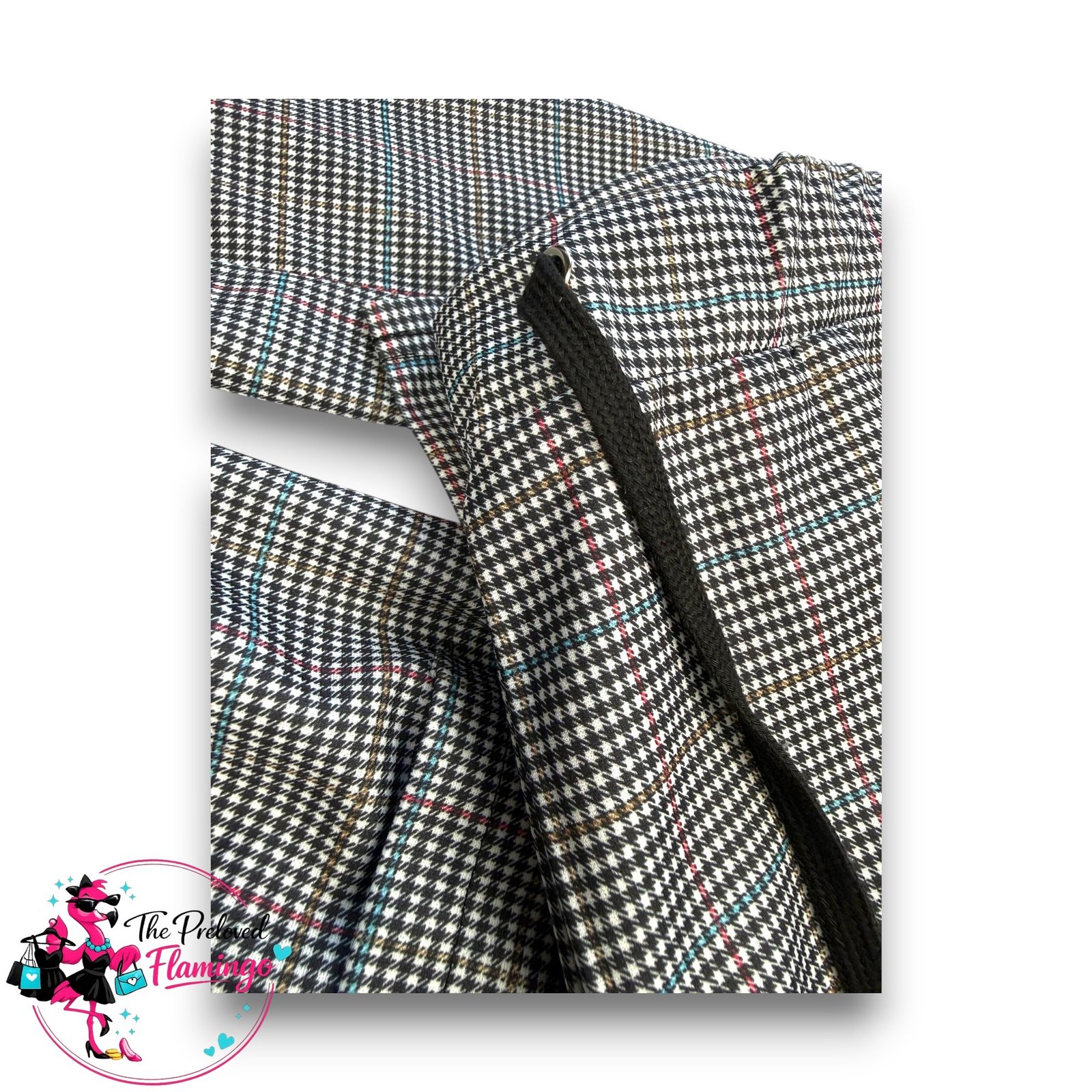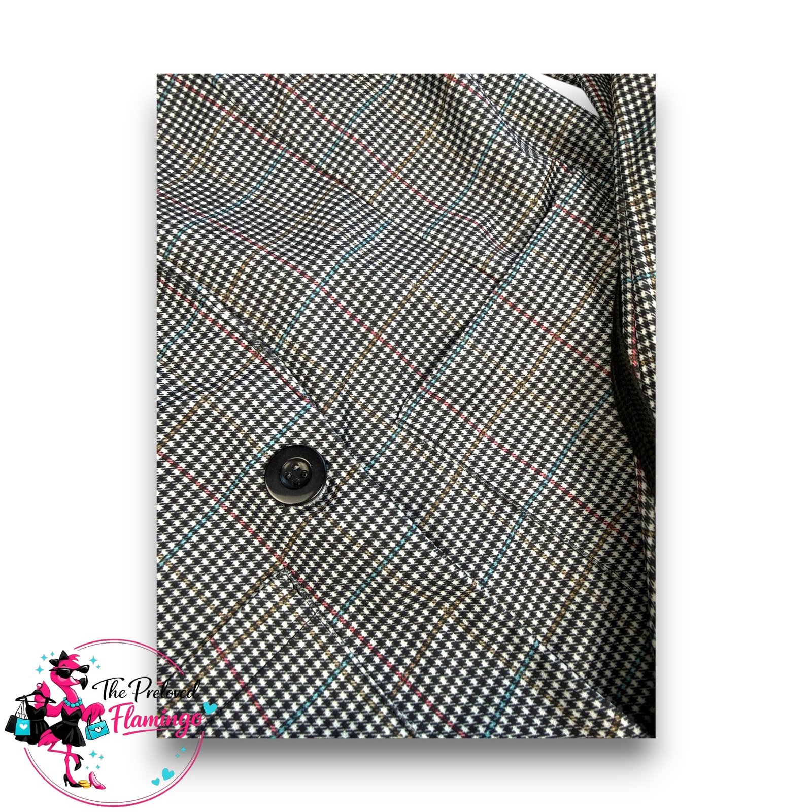 This stylish two-piece suit set features a classic black and white houndstooth check with subtle coloured lines running through for added detail. The blazer has a structured tailored fit with a single button fastening and functional pockets, while the matching trousers feature a comfortable drawstring waist for an easy, flattering fit.