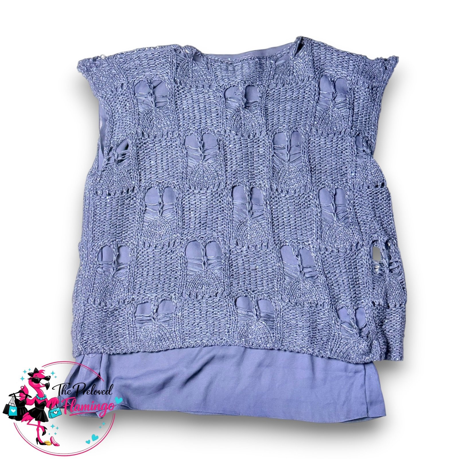Stylish Dunnes Stores layered top featuring a unique textured knit overlay with subtle sparkly sequins over a soft fully lined blouse base. The outer knitted layer has an eye-catching open textured pattern with delicate sequin detailing, giving the top a lovely shimmer when it catches the light.