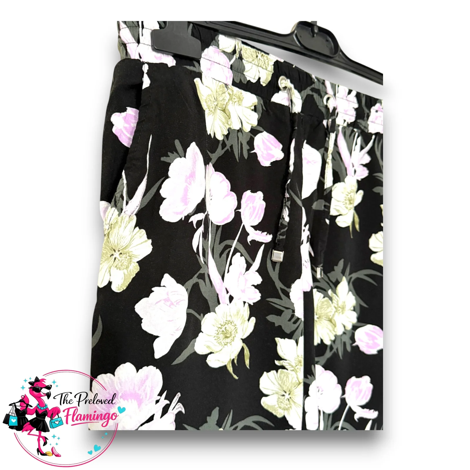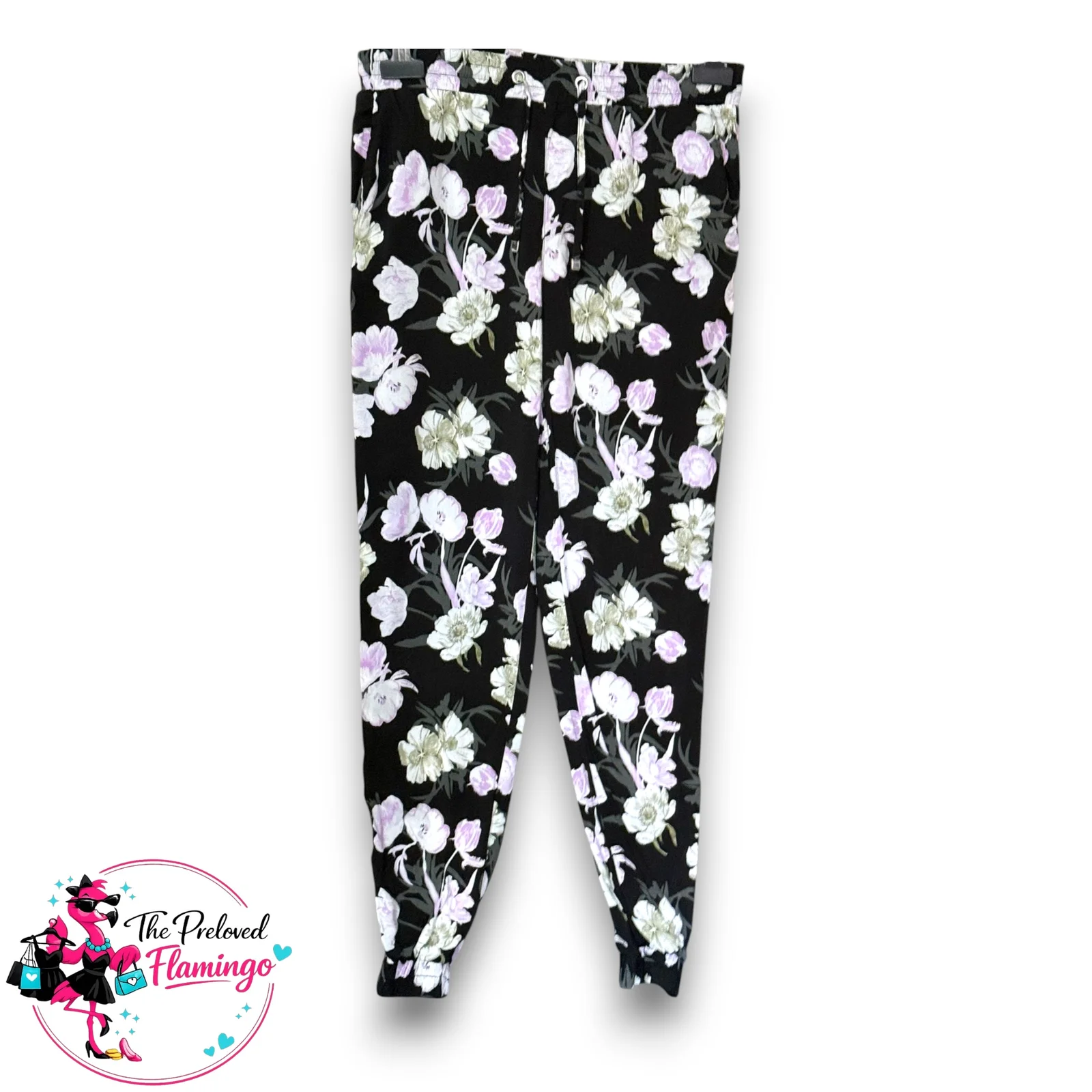 F&F Black Floral Tapered Trousers – Drawstring Waist Joggers – Pockets – Size 10