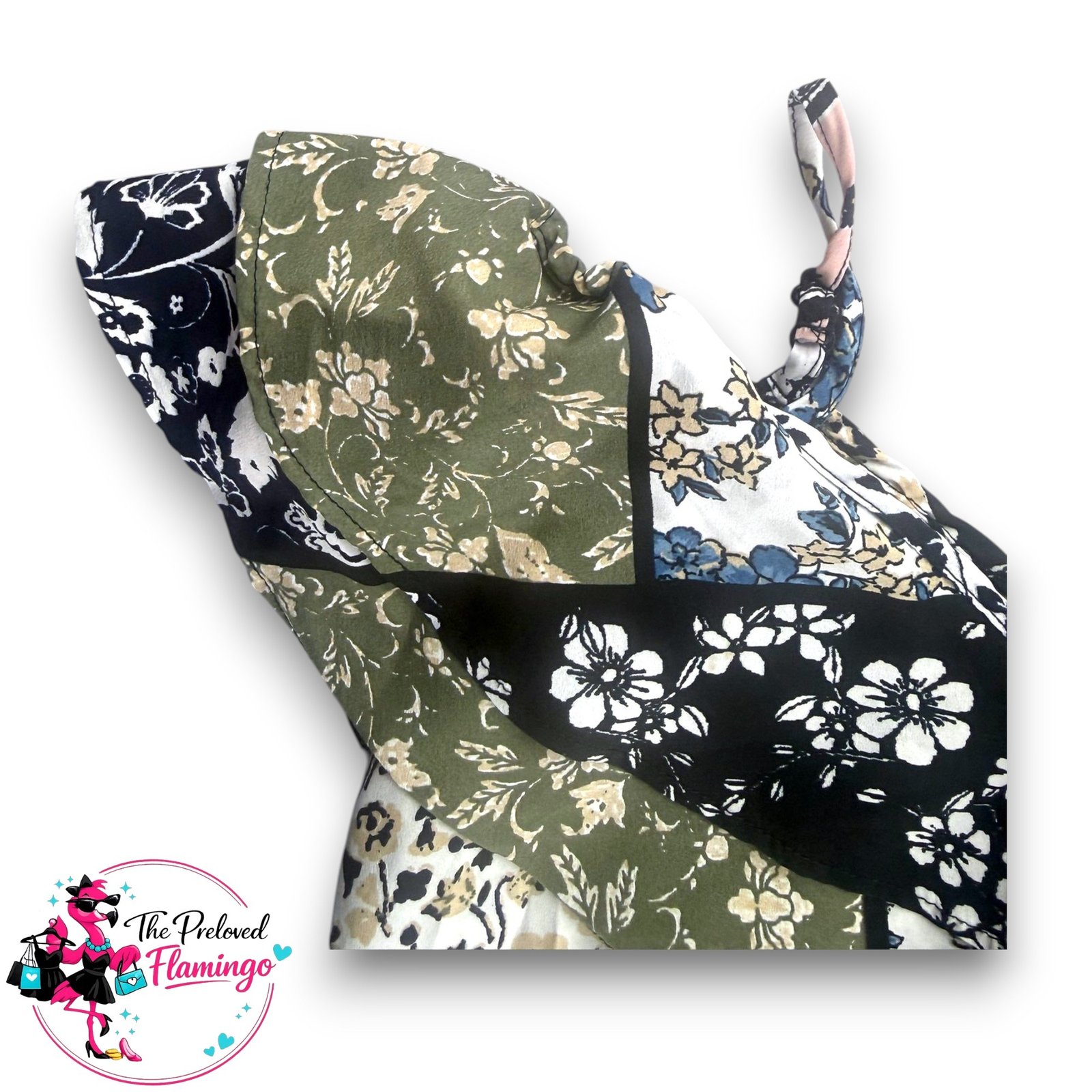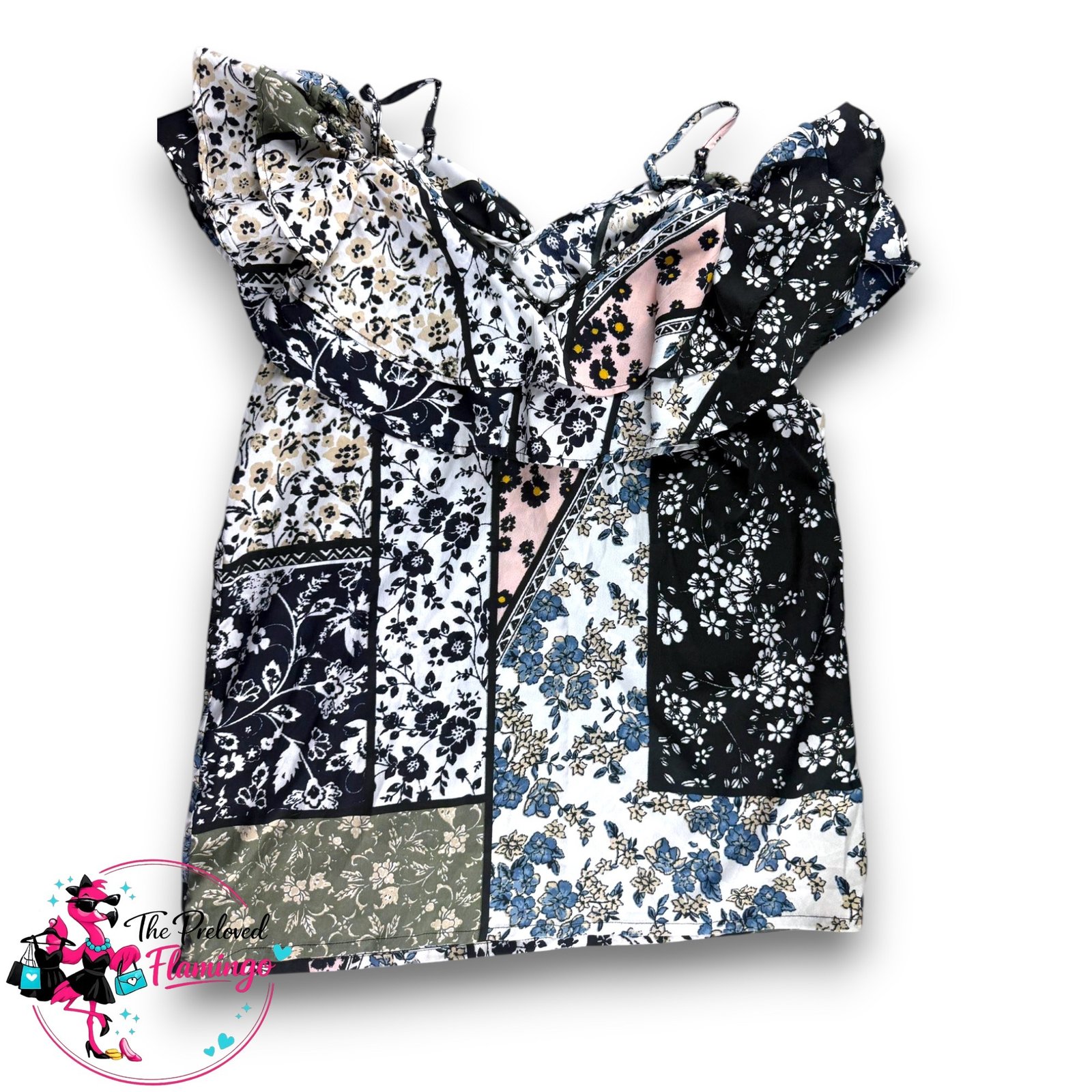 This unique patchwork-style top features a mix of floral prints in neutral and earthy tones, creating a standout boho-inspired look. Designed with cold shoulder cut-outs, adjustable straps and a soft ruffle neckline for a flattering, feminine finish.