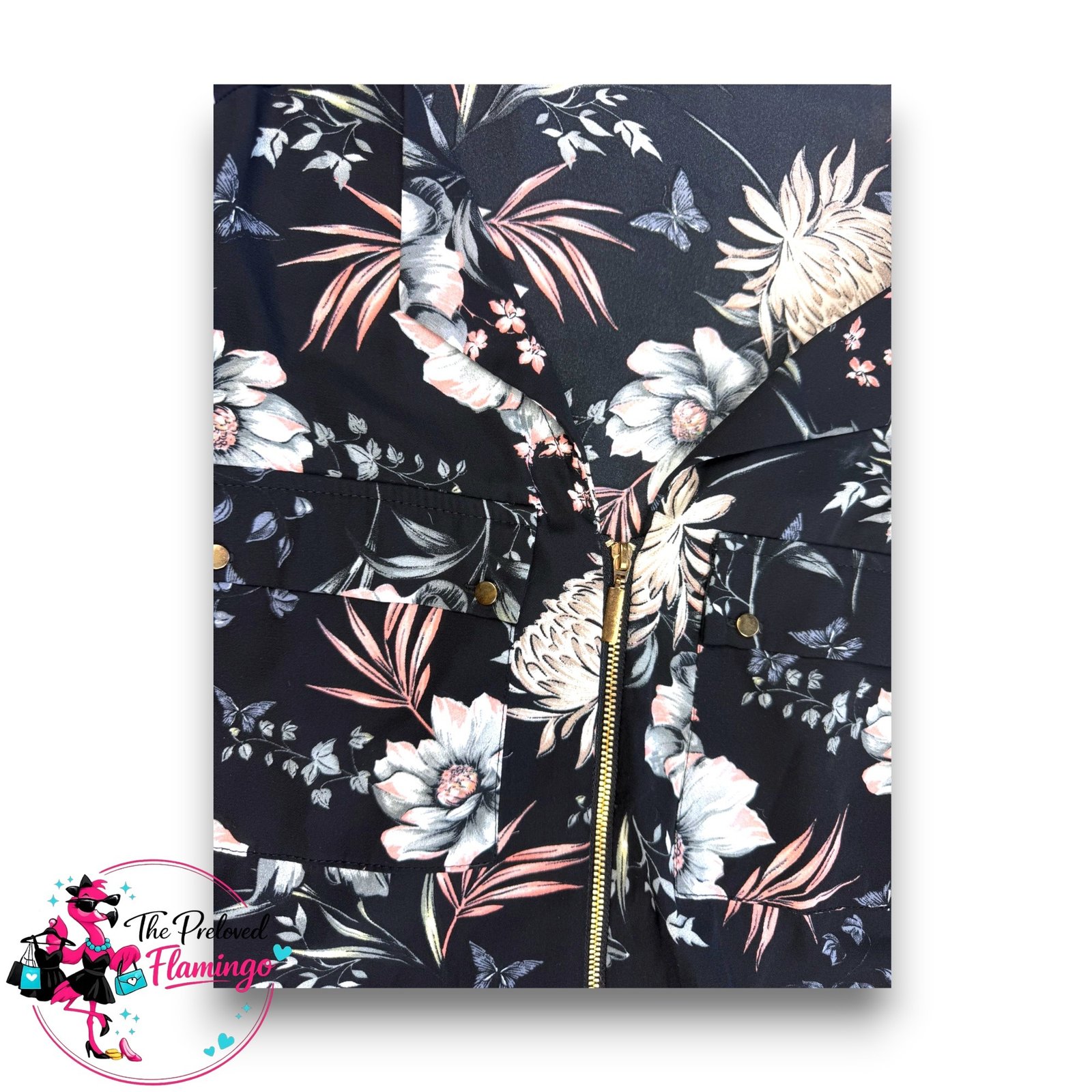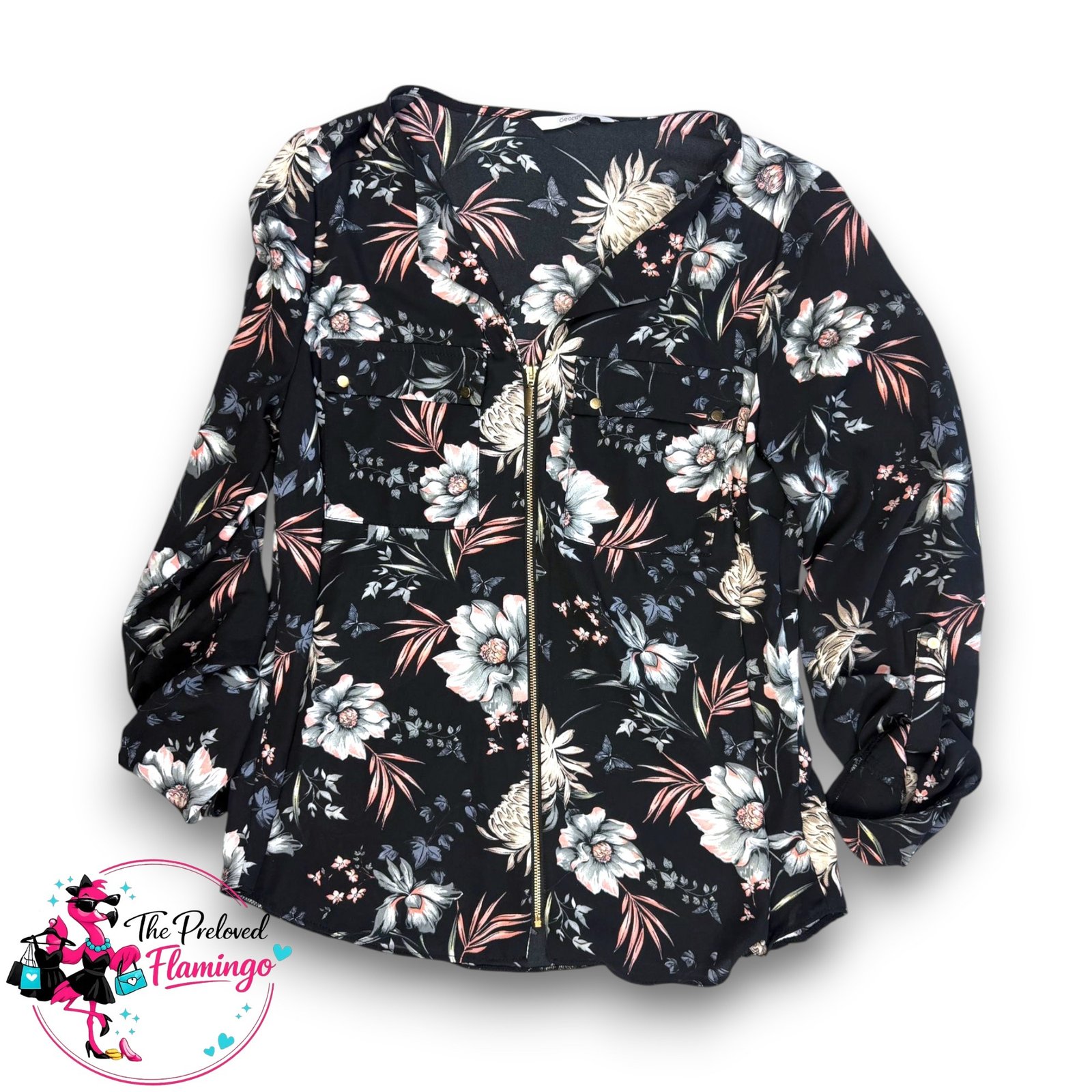George Black Floral Zip Up Blouse Lightweight Jacket Shirt Long Sleeve Collared Casual - UK 12George Black Floral Zip Up Blouse Lightweight Jacket Shirt Long Sleeve Collared Casual – UK 12