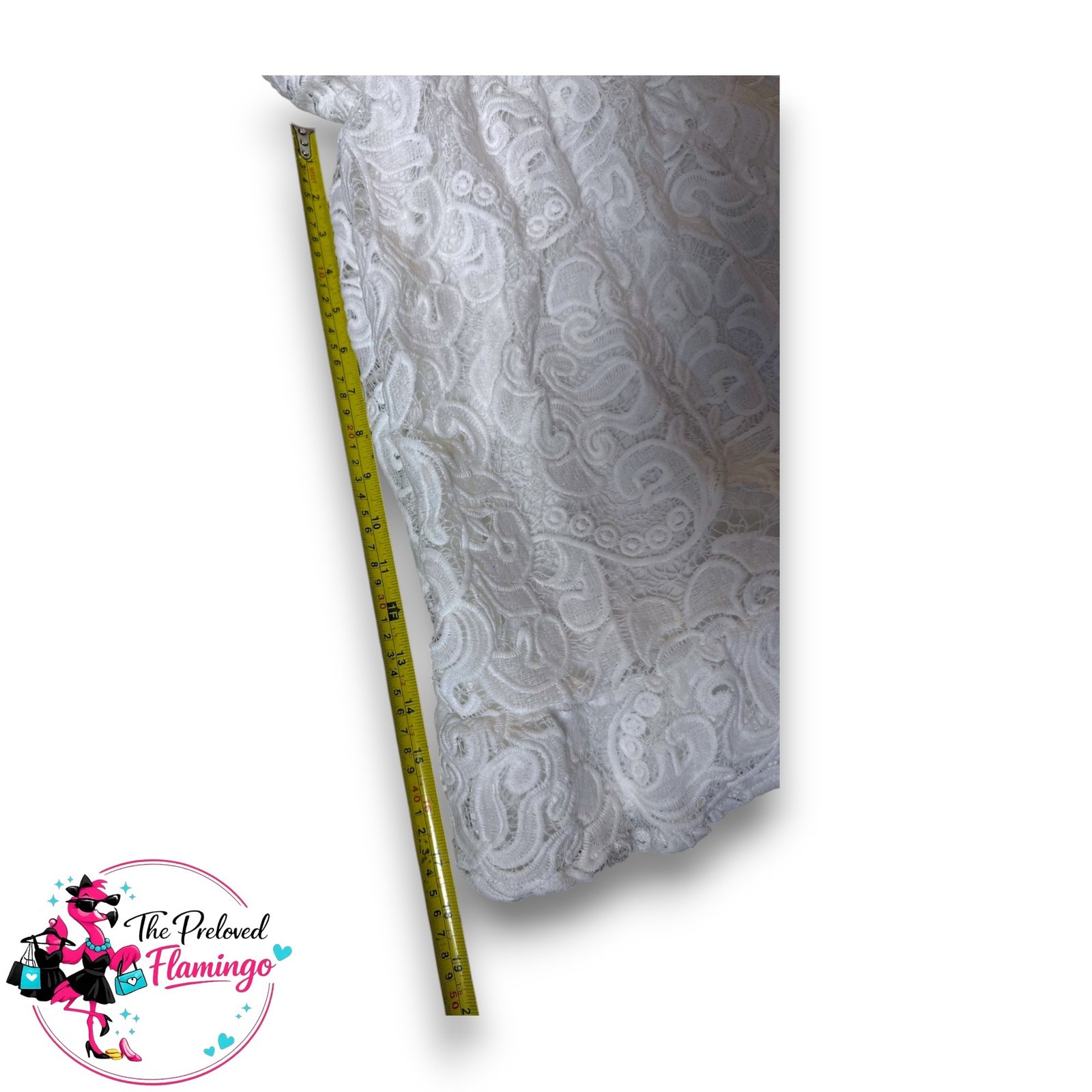 Beautiful white lace dress featuring an intricate crochet lace design throughout with a flattering high neckline and soft frill hem. Fully lined so not see-through, with a zip fastening at the back for a secure fit.