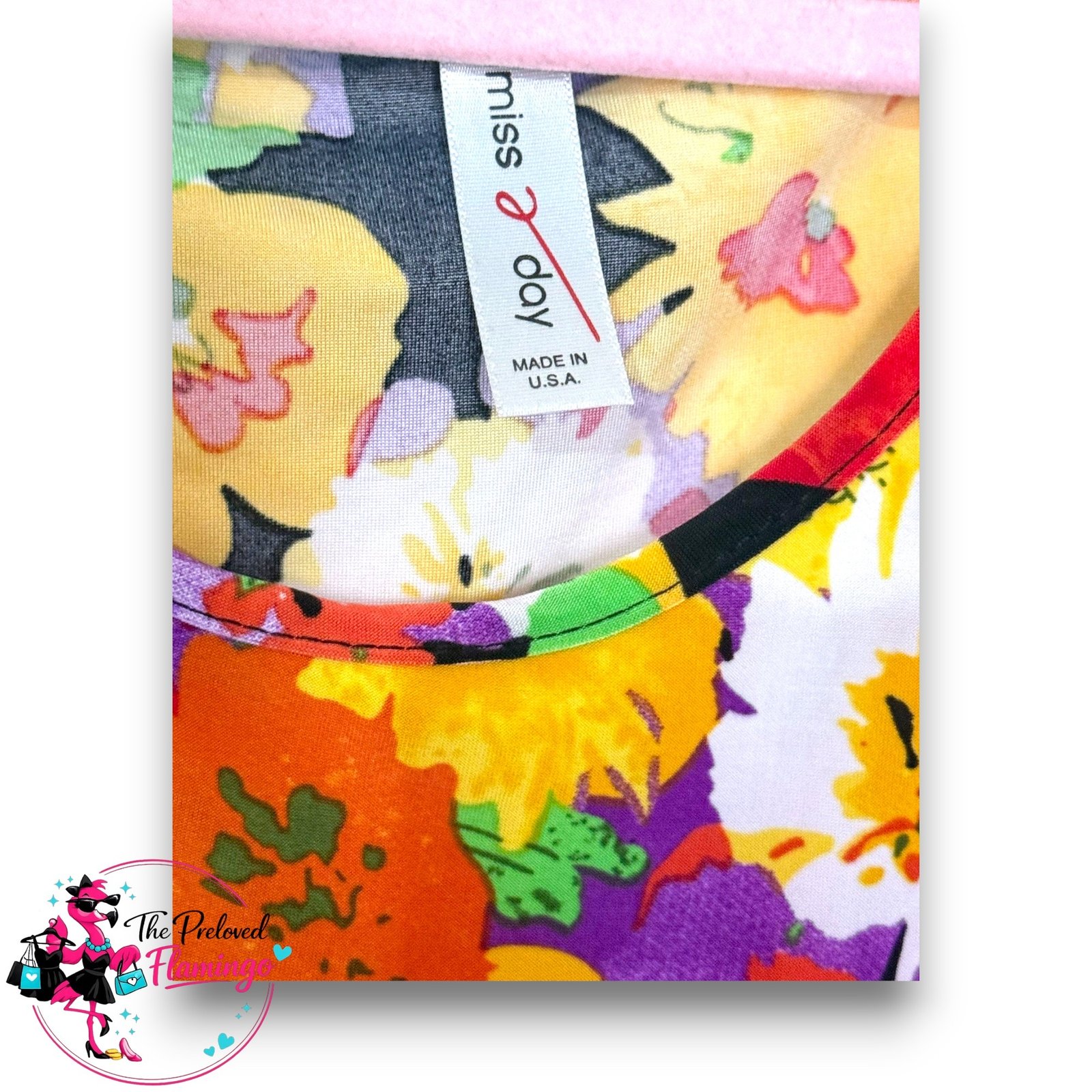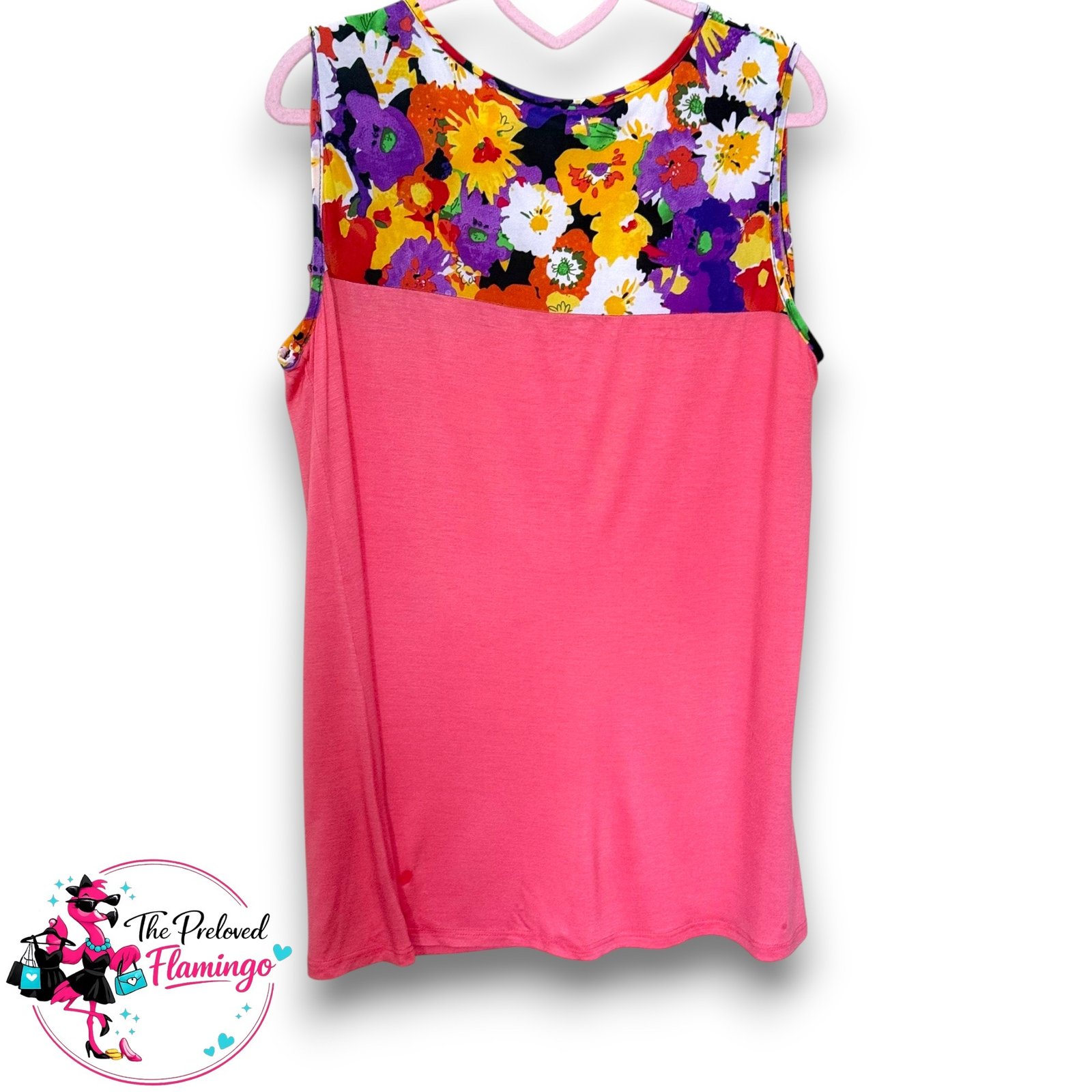 Lovely pink sleeveless vest top featuring a vibrant floral print panel across the chest with colourful flowers in yellow, purple, red, white and green. The bright floral design gives this top a really fun, summery and vintage-inspired feel.