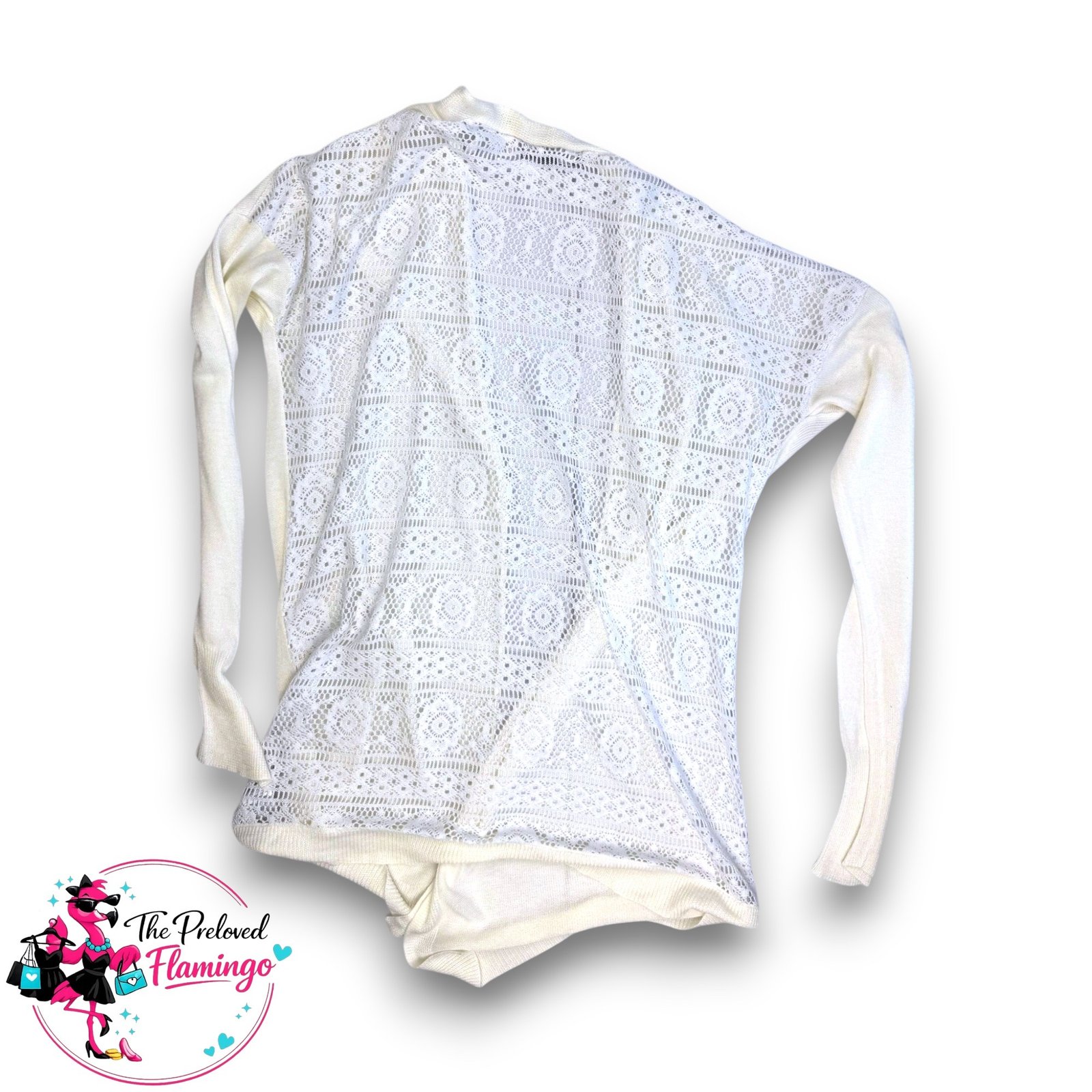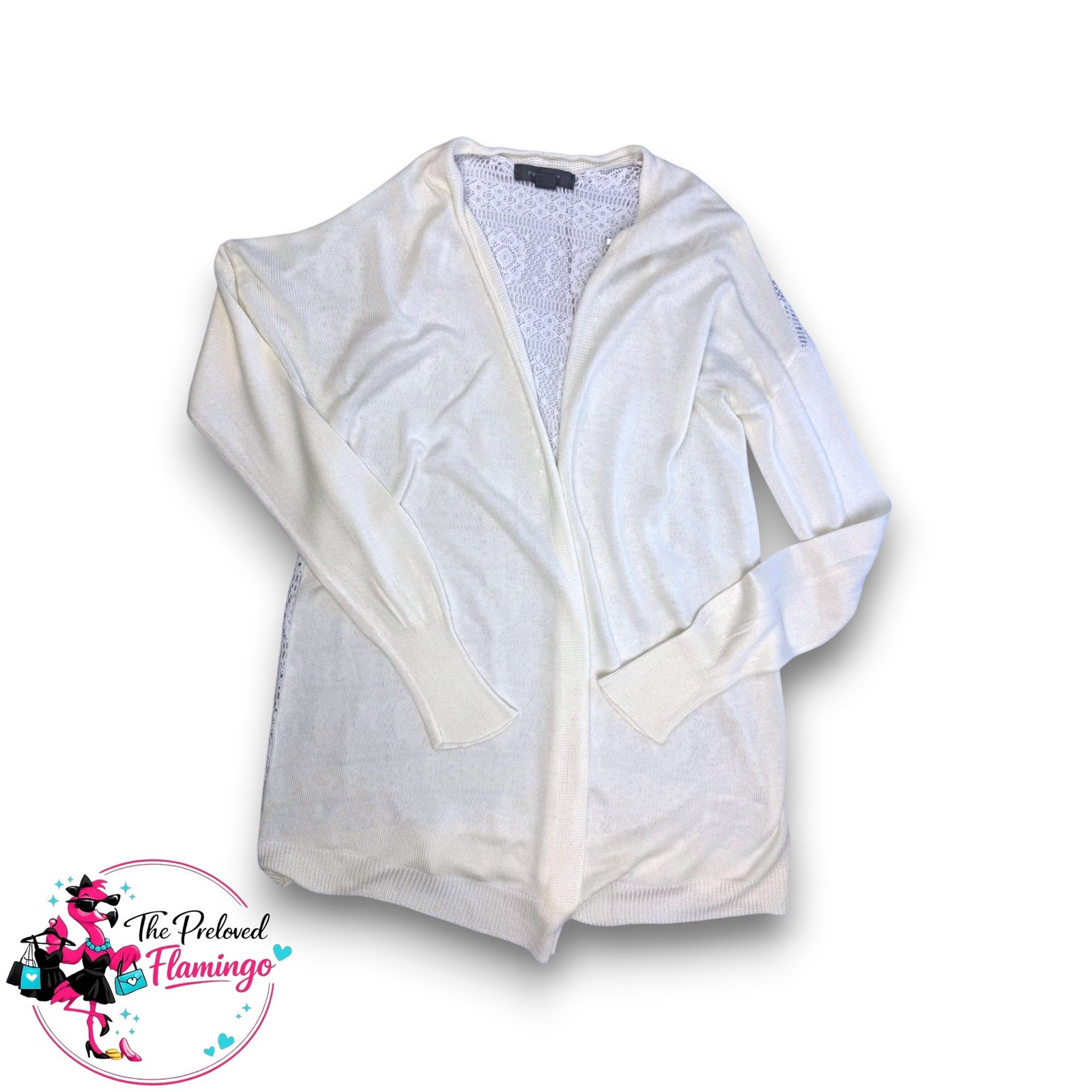 Primark Cream Open Front Cardigan Lace Back Crochet Detail Long Sleeve Lightweight Knit – Size UK 10-12 (US 6-8 / EU 38-40).