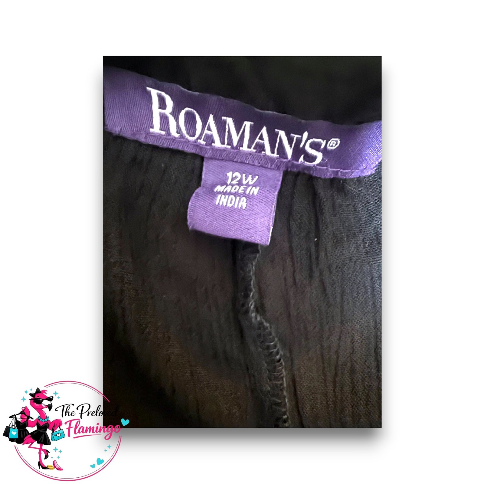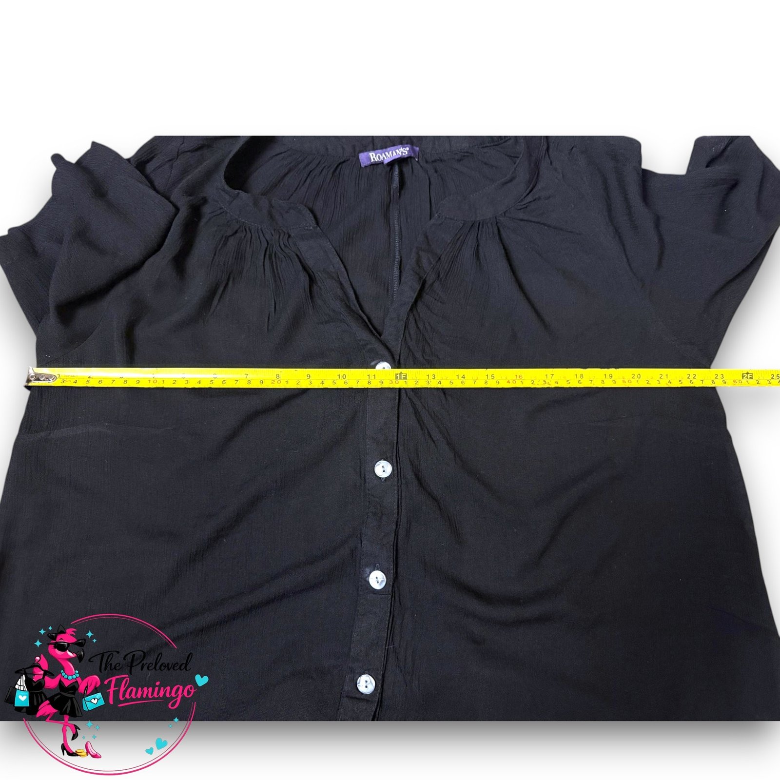 A gorgeous easy-to-wear black blouse from Roaman’s, designed with comfort and a flattering relaxed fit in mind. Features a soft gathered neckline with button-down front and a lightweight floaty fabric that drapes beautifully.