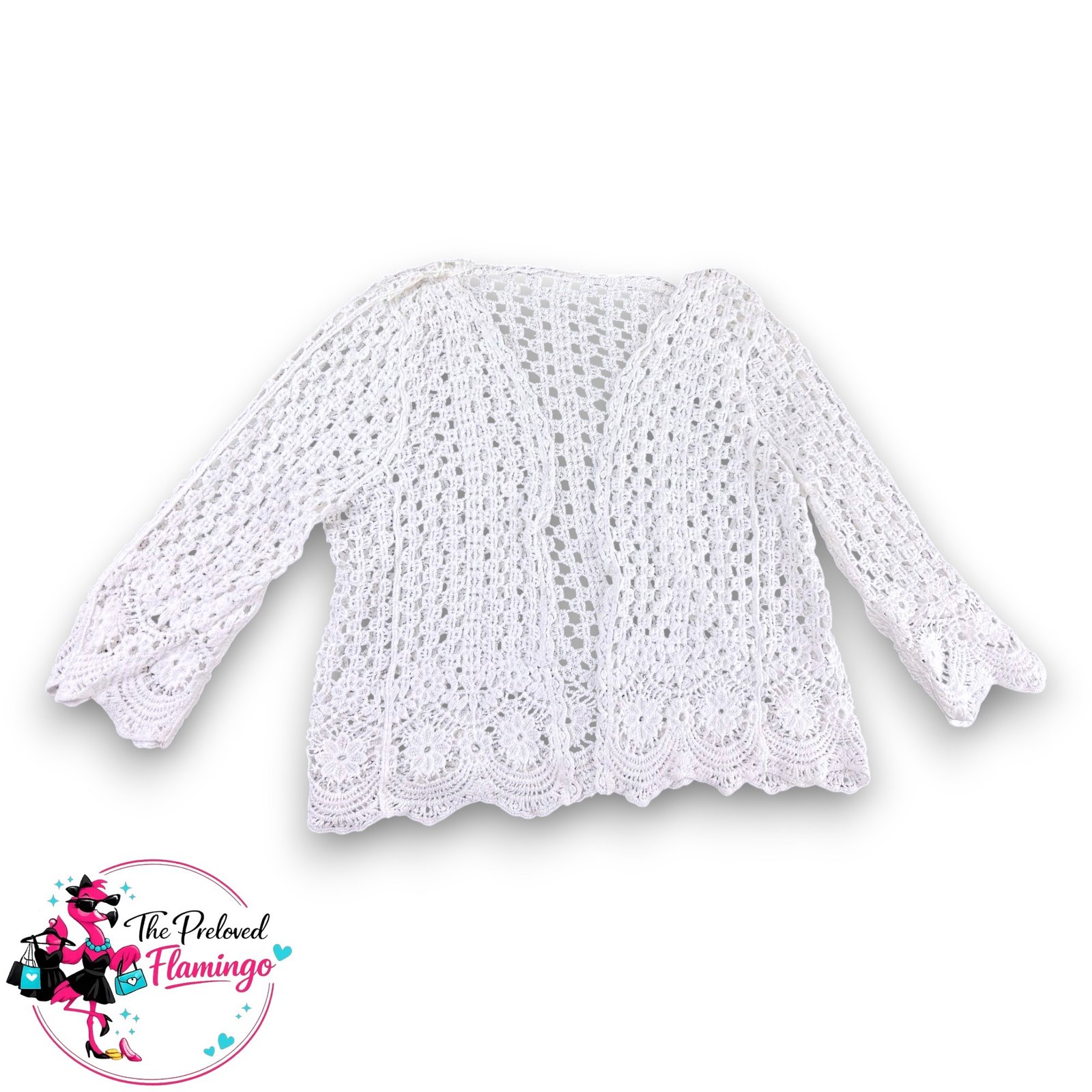 Beautiful lightweight crochet cardigan with a delicate lace design and scalloped hem detailing. Perfect for layering over dresses, bikinis or casual outfits for that effortless boho look.